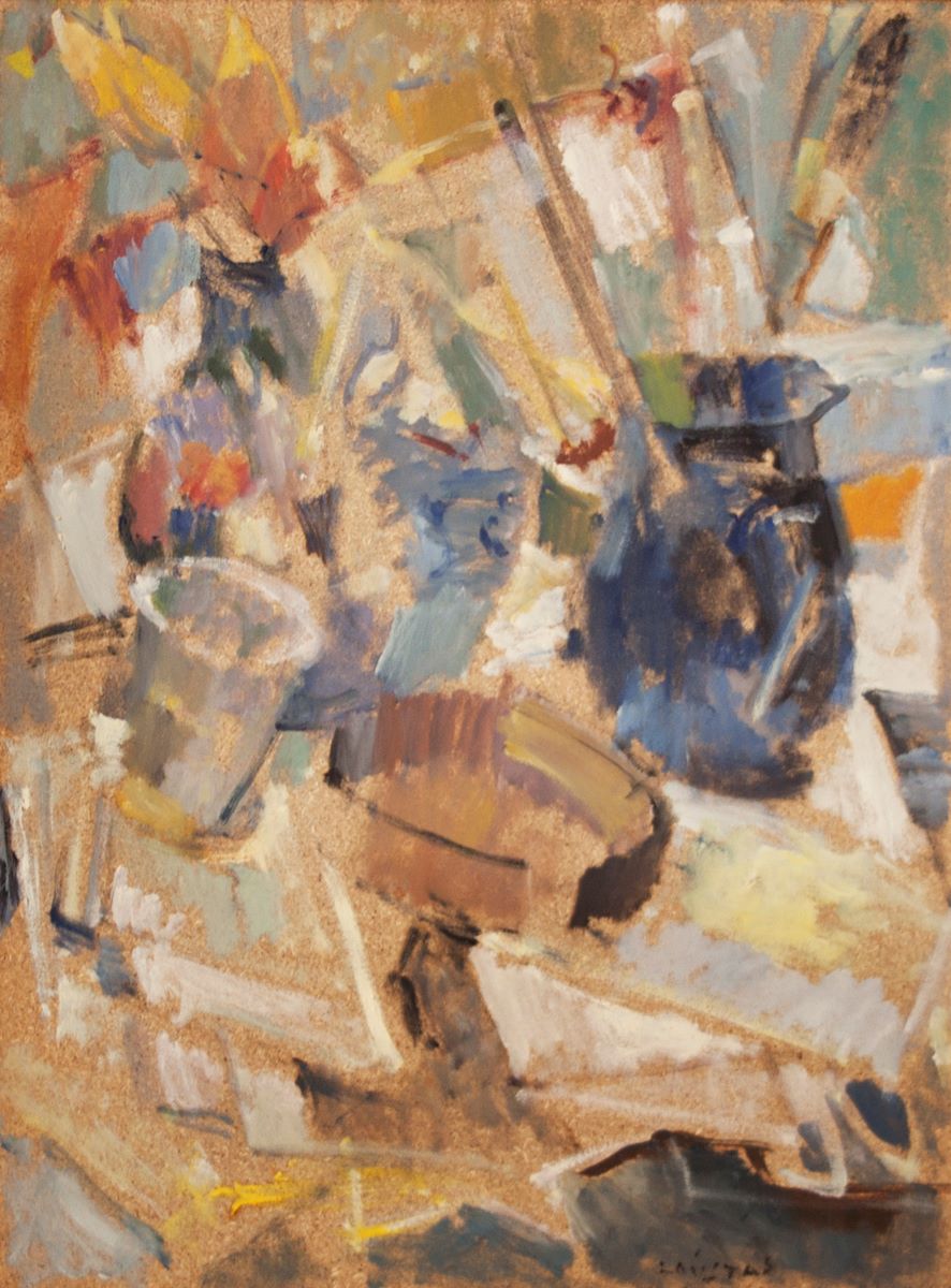 This is a selection of oil and gouache still lives, including interior views of the well-ordered clutter in his ateliers. The artworks span a period of six decades, and feature some of the painter’s most favourite subjects, such as vases with his paint brushes, the Viennese chair, bamboo furniture, the Greek flag, his violin, dried and fresh flowers, alcohol, bottles and ashtrays.